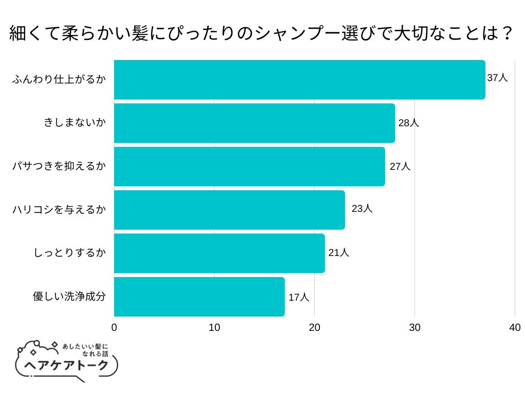 「細くて柔らかい髪にぴったりのシャンプー選びで大切なことは?」とアンケート調査した結果、1位は『ふんわり仕上がるか』でした。 1位 ふんわり仕上がるか
